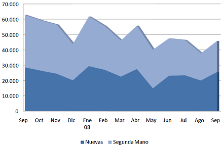 Si hace un año se vendieron 62.862 viviendas en septiembre, este septiembre pasado sólo se han vendido 45.809. Un 27,13% menos. Pero si nos fijamos en los datos de los últimos 12 meses, veremos que donde más se recortan las ventas es en las viviendas usadas. Mientras que la venta de viviendas nuevas ha descendido un 10% (que no es poco), la venta de usadas ha descendido un 40%.